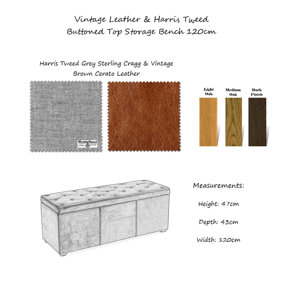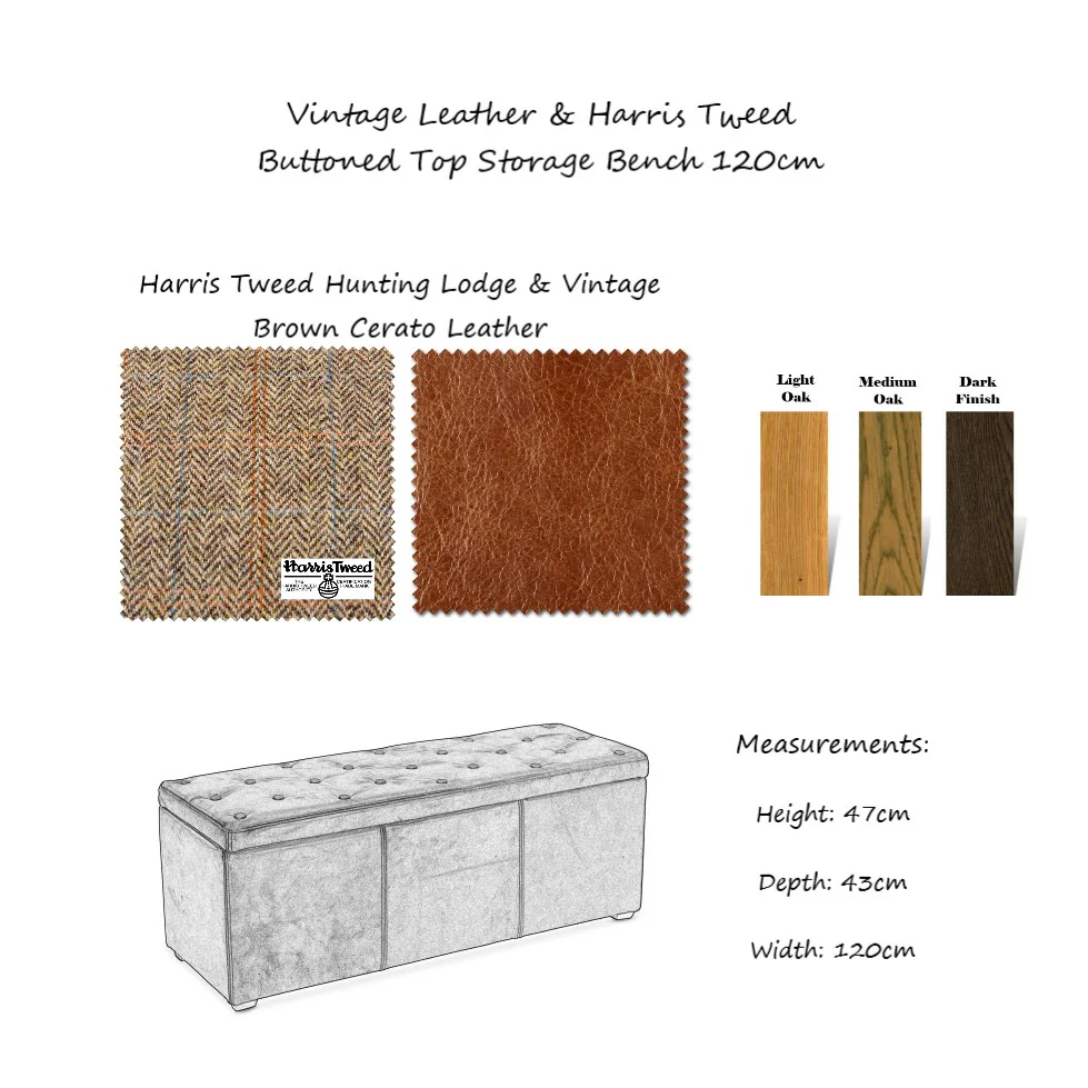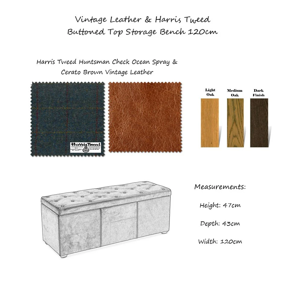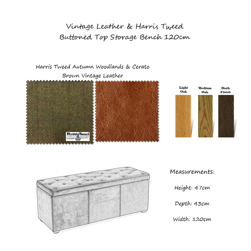Vintage Leather & Harris Tweed Buttoned Top Storage Bench 120cm