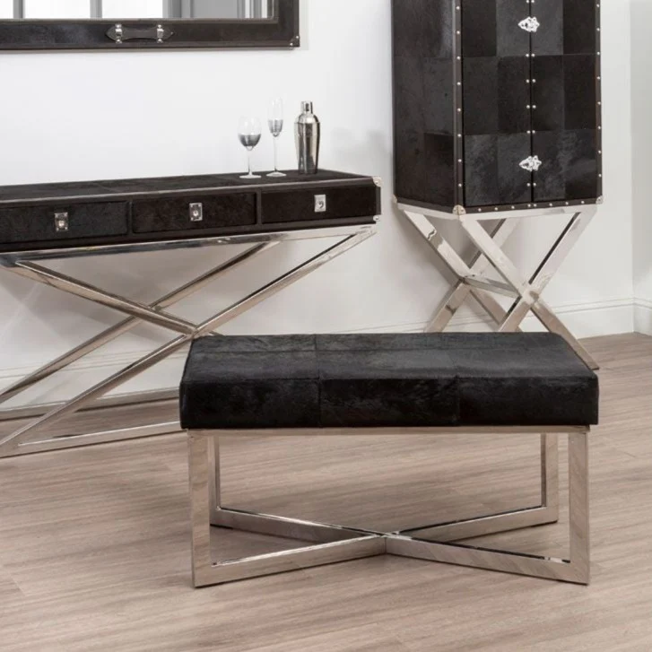 Townhouse Genuine Black Leather & Stainless Steel Base Bench