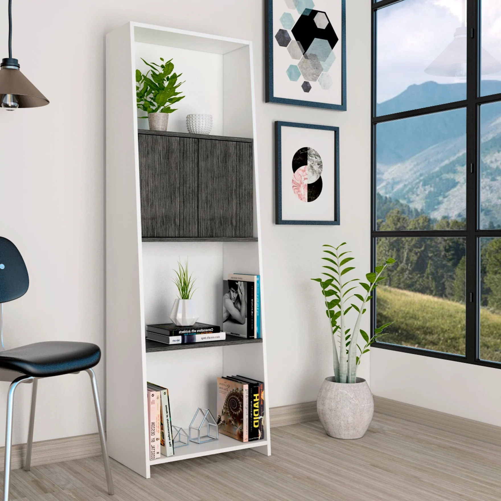 Detroit White & Carbon Grey Oak Woodgrain Bookcase With Door & Open Shelving